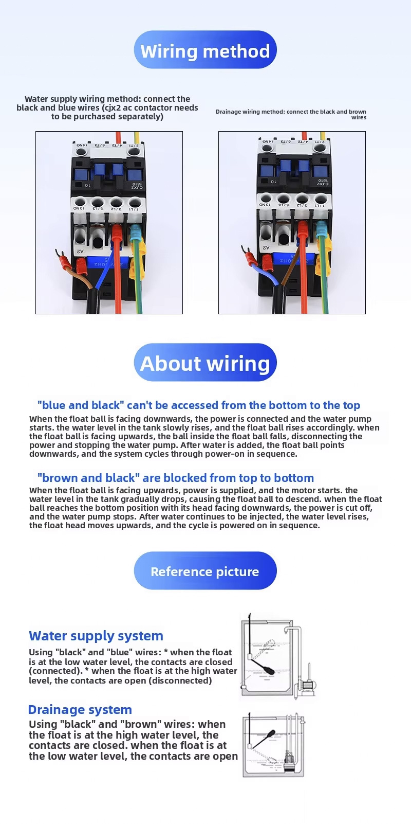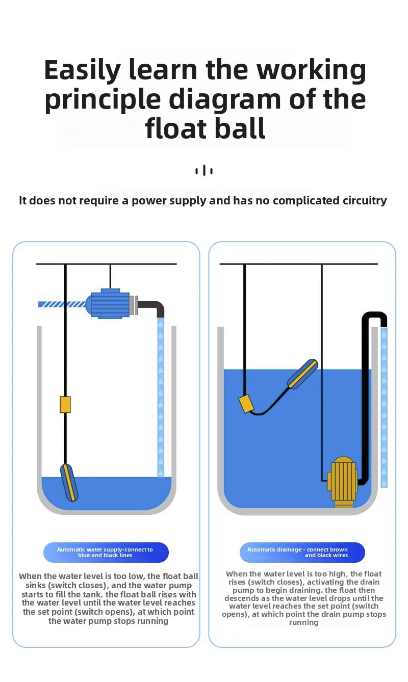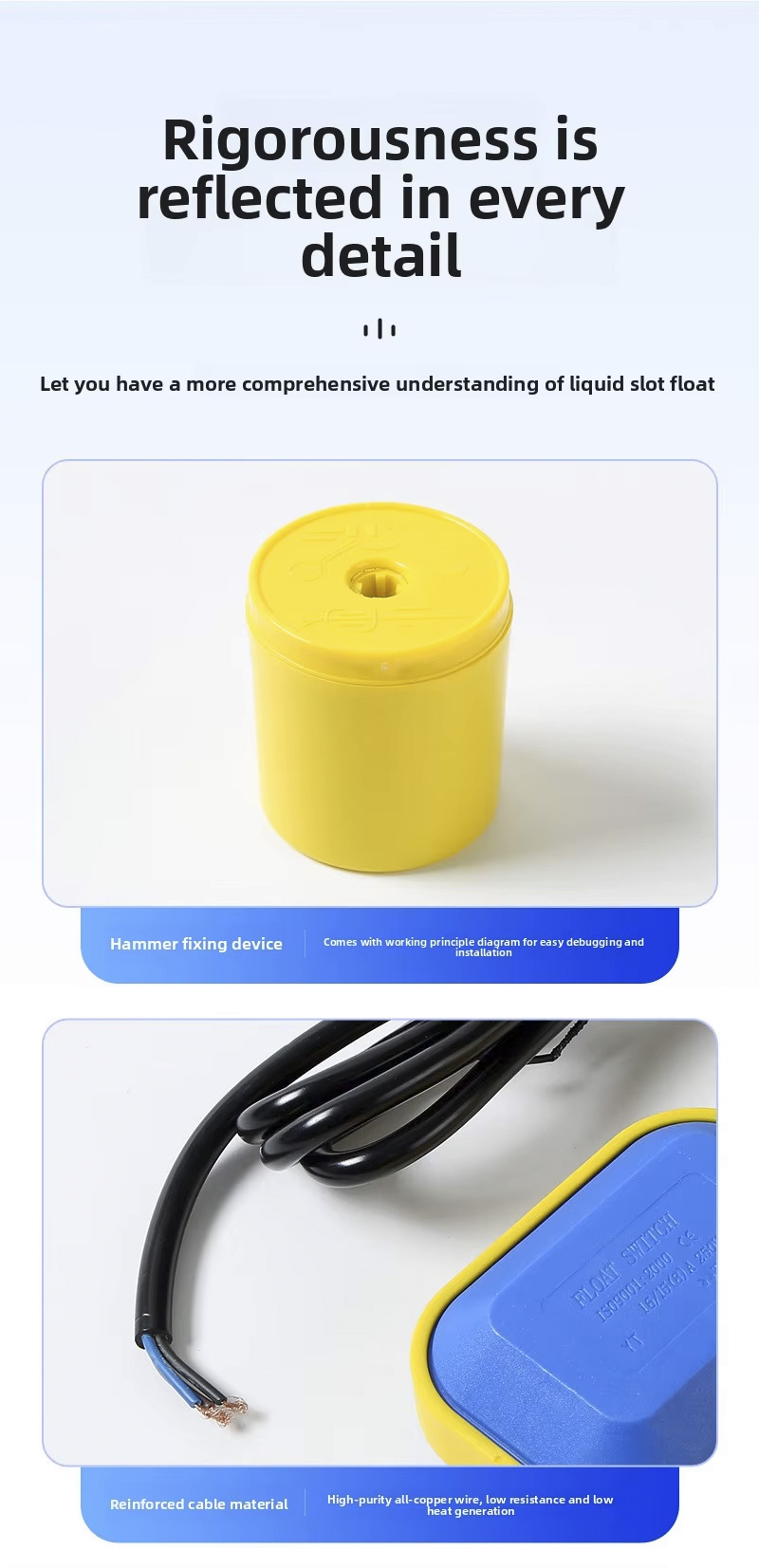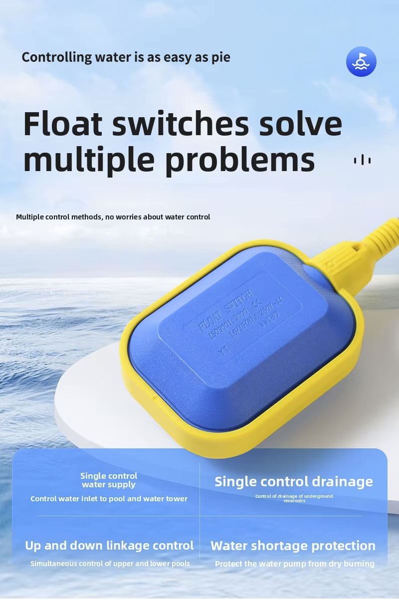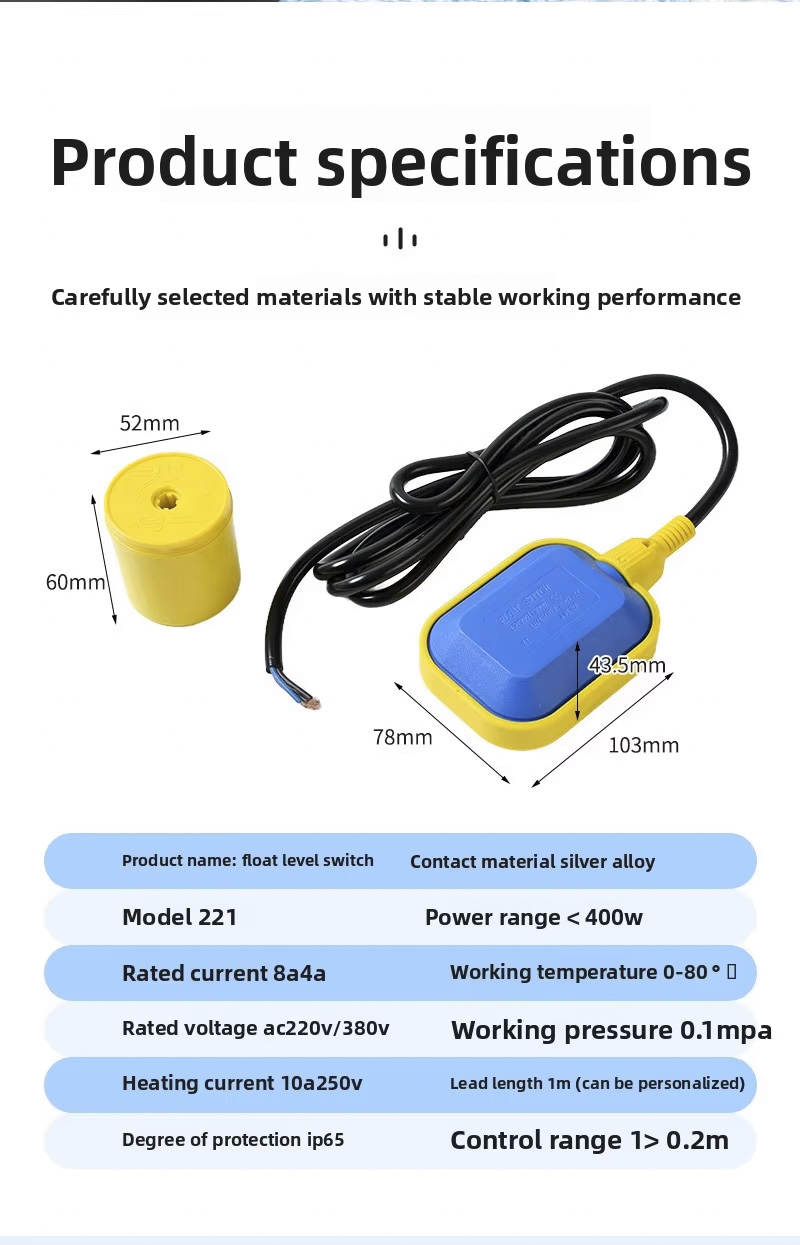To plovno stikalo ima veliko krožno zasnovo z 2m、3m、5m、10m,stopnjo zaščite IP68 in deluje pri temperaturah od 0 ℃ do 80 ℃,Podpira širok razpon napetosti od 110V do 220V in ima robusten delovni tlak ±0,5Mpa. Izdelek je prilagodljiv z lasersko gravuro, reliefno logotipi ali storitve OEM/ODM, kar zagotavlja prilagodljivost za različne aplikacije.