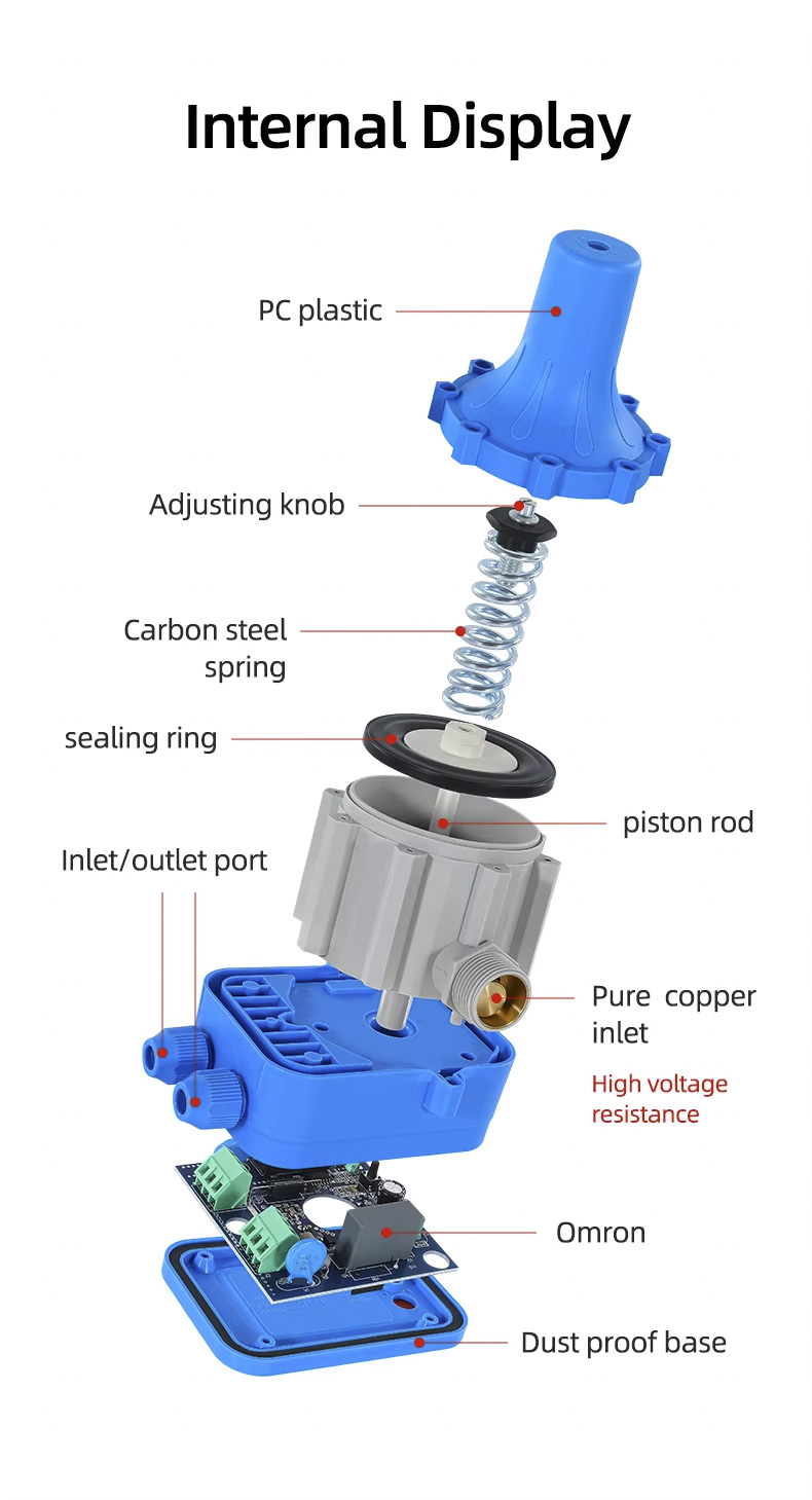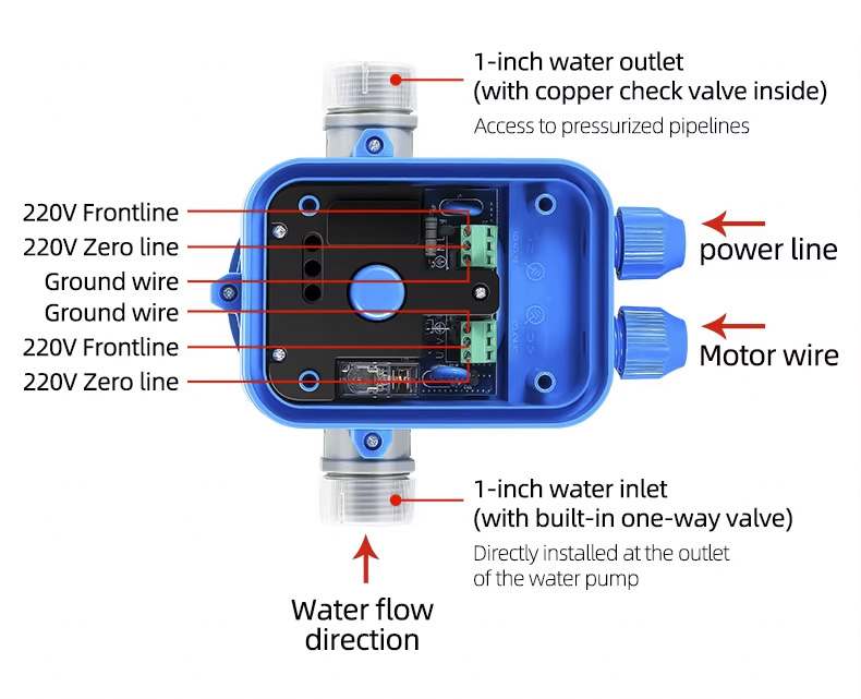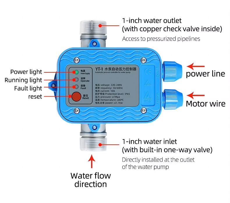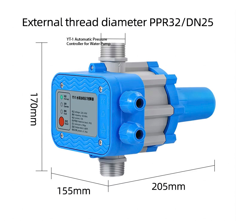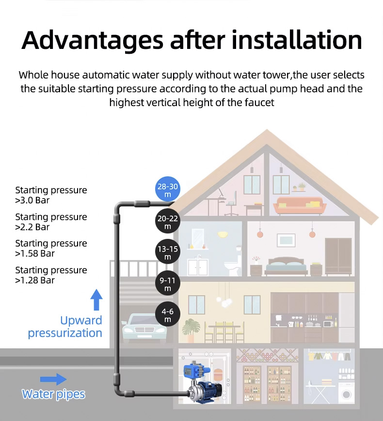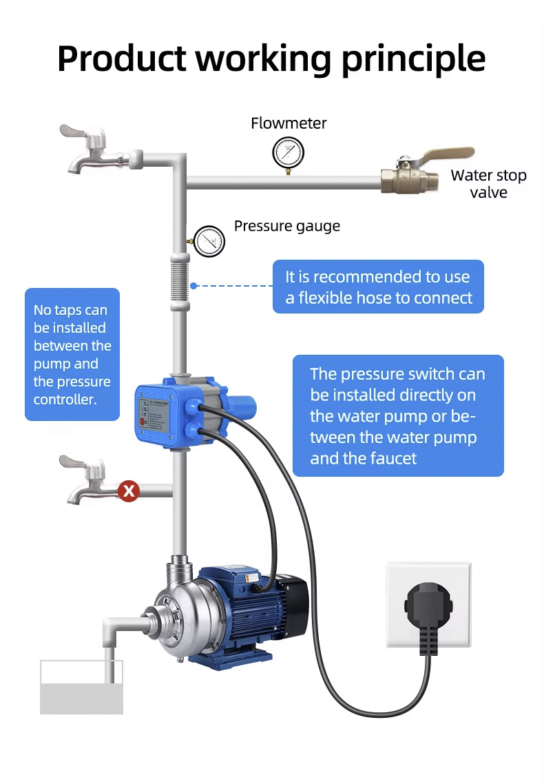 Avtomatski krmilnik črpalke Elektronski regulator tlaka vodne črpalke lahko nadomesti zapletene namestitve avtomatske vodne črpalke. Ima lastnosti stabilne zmogljivosti, nizkega vzdrževanja in dolge življenjske dobe.