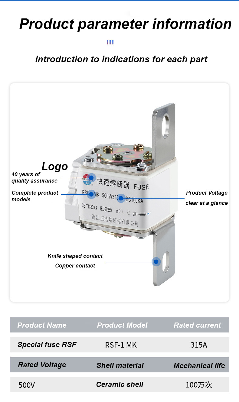 ima nazivno napetost 500 V in nazivni tok 315 A, kar lahko učinkovito zagotovi električno varnost, prepreči preobremenitev in kratek stik. Varovalke RSF-1K 500V-315A BC100KA