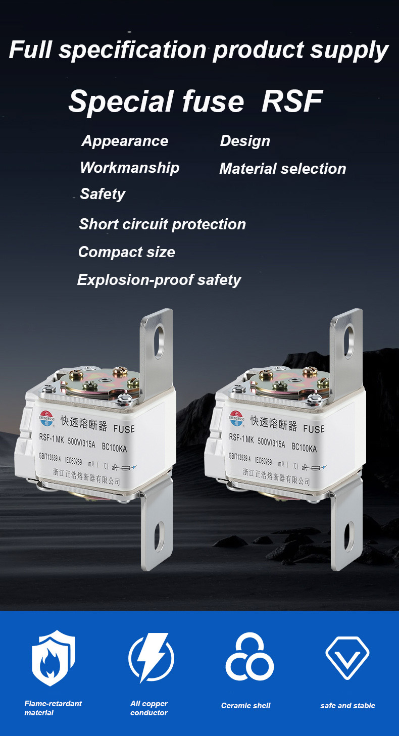 Varovalni vložki RSF-1MK 500V-315A BC100KA so visokozmogljivi industrijski odklopniki, primerni za visokozmogljive scenarije električne zaščite. Varovalke RSF-1K 500V-315A BC100KA